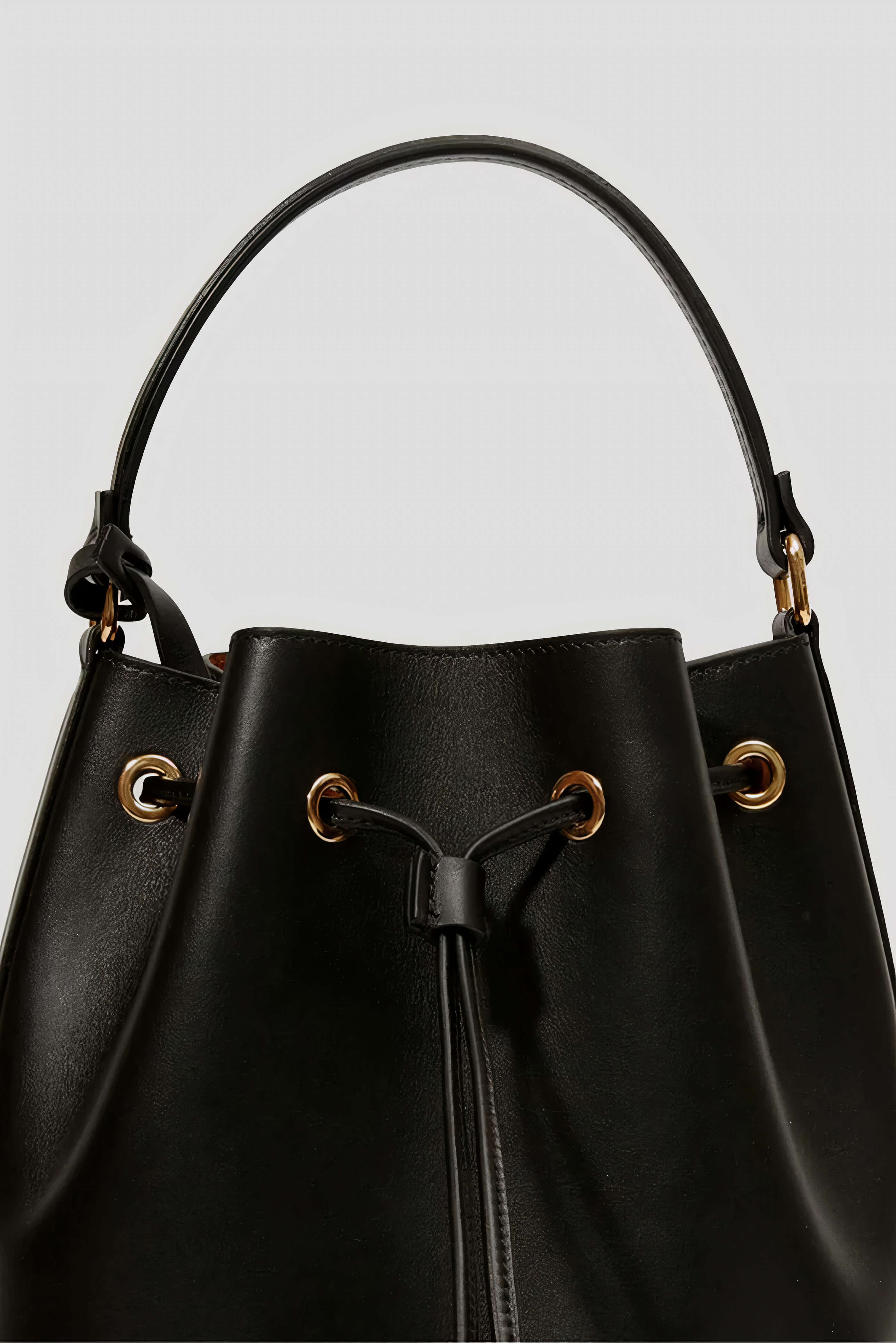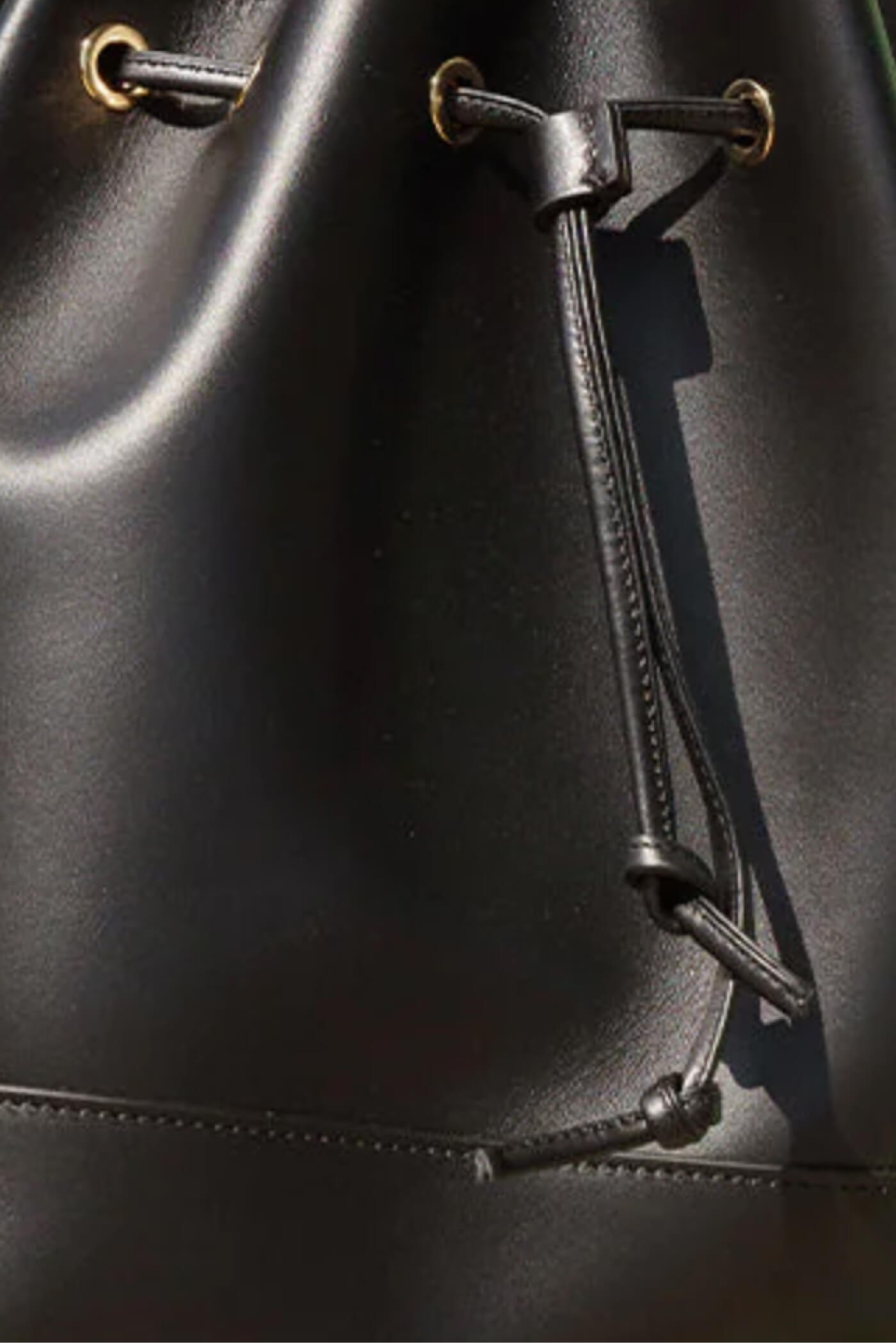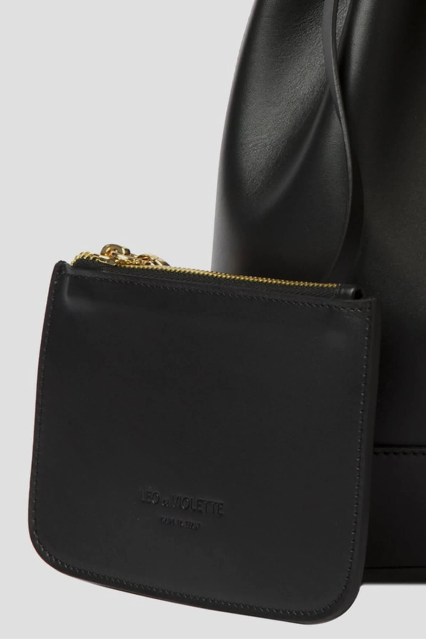 Minimalist bucket bag fully lined in leather. Can be carried by hand with its handle or on the shoulder with its leather shoulder strap. Detachable inner pocket. Sack bottom with metal studs.