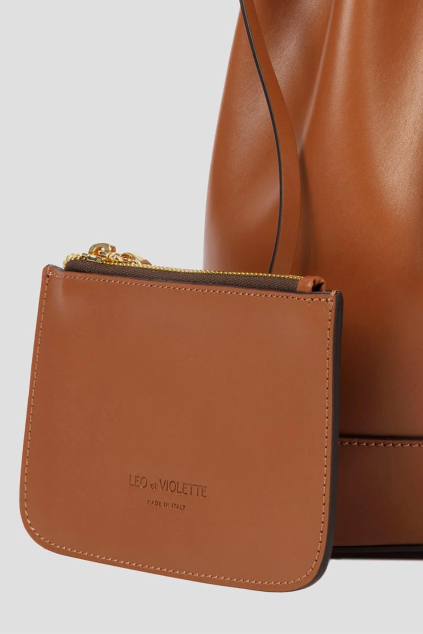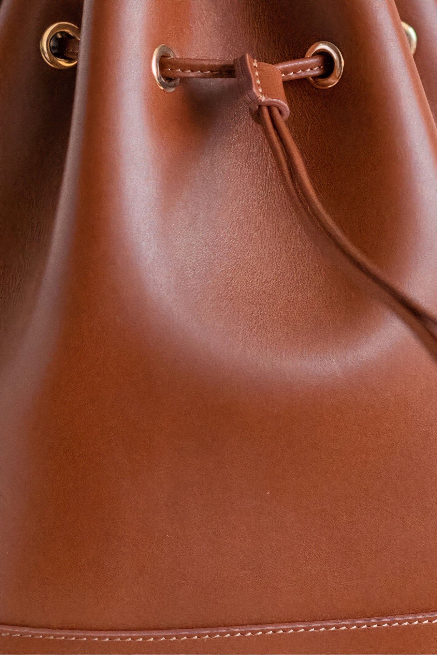 Minimalist bucket bag fully lined in leather. Can be carried by hand with its handle or on the shoulder with its leather shoulder strap. Detachable inner pocket. Sack bottom with metal studs.