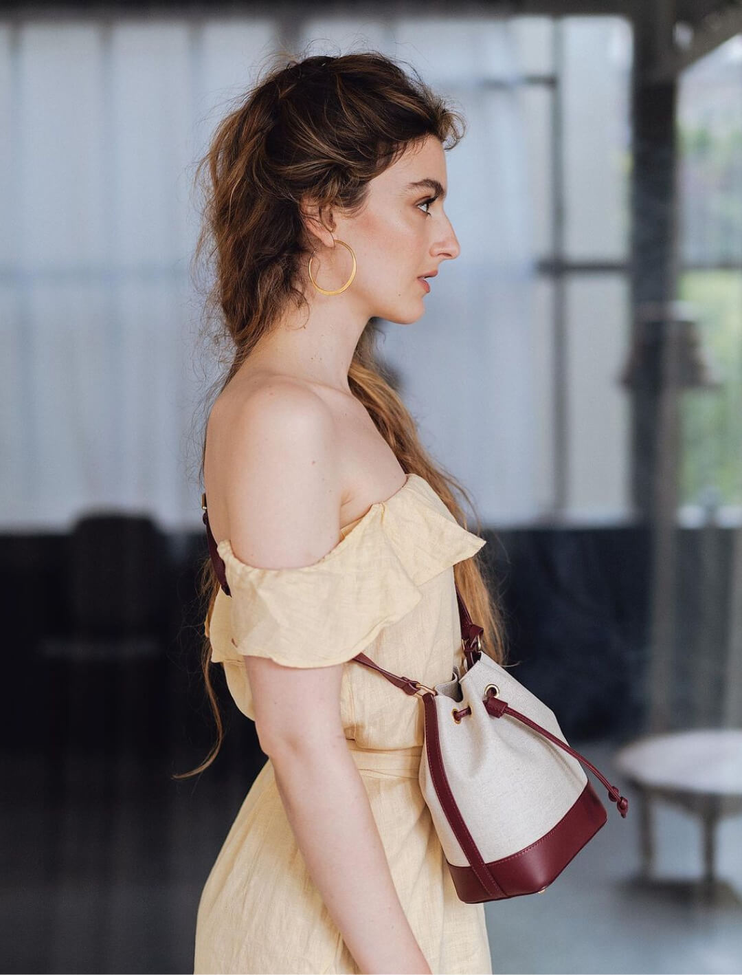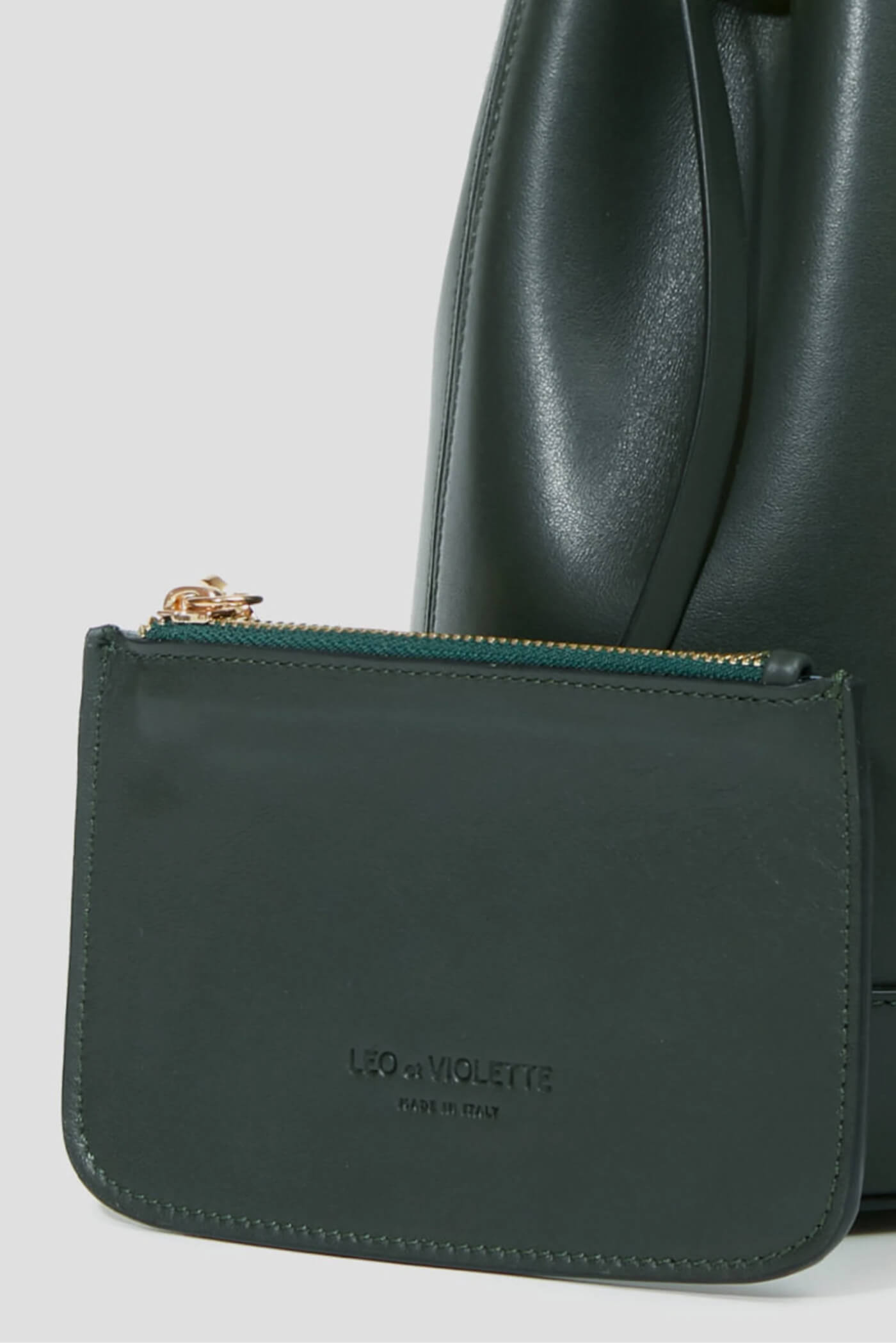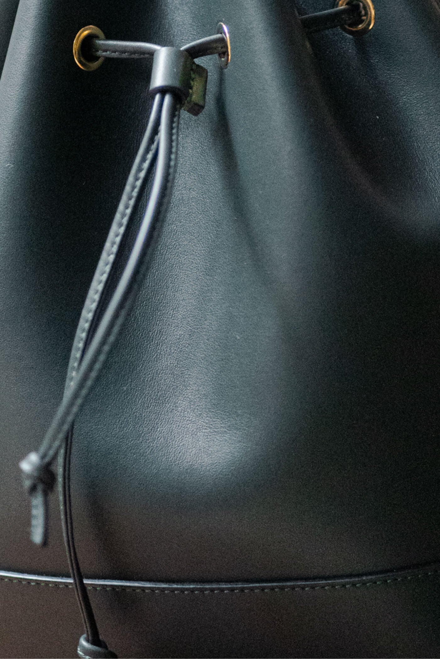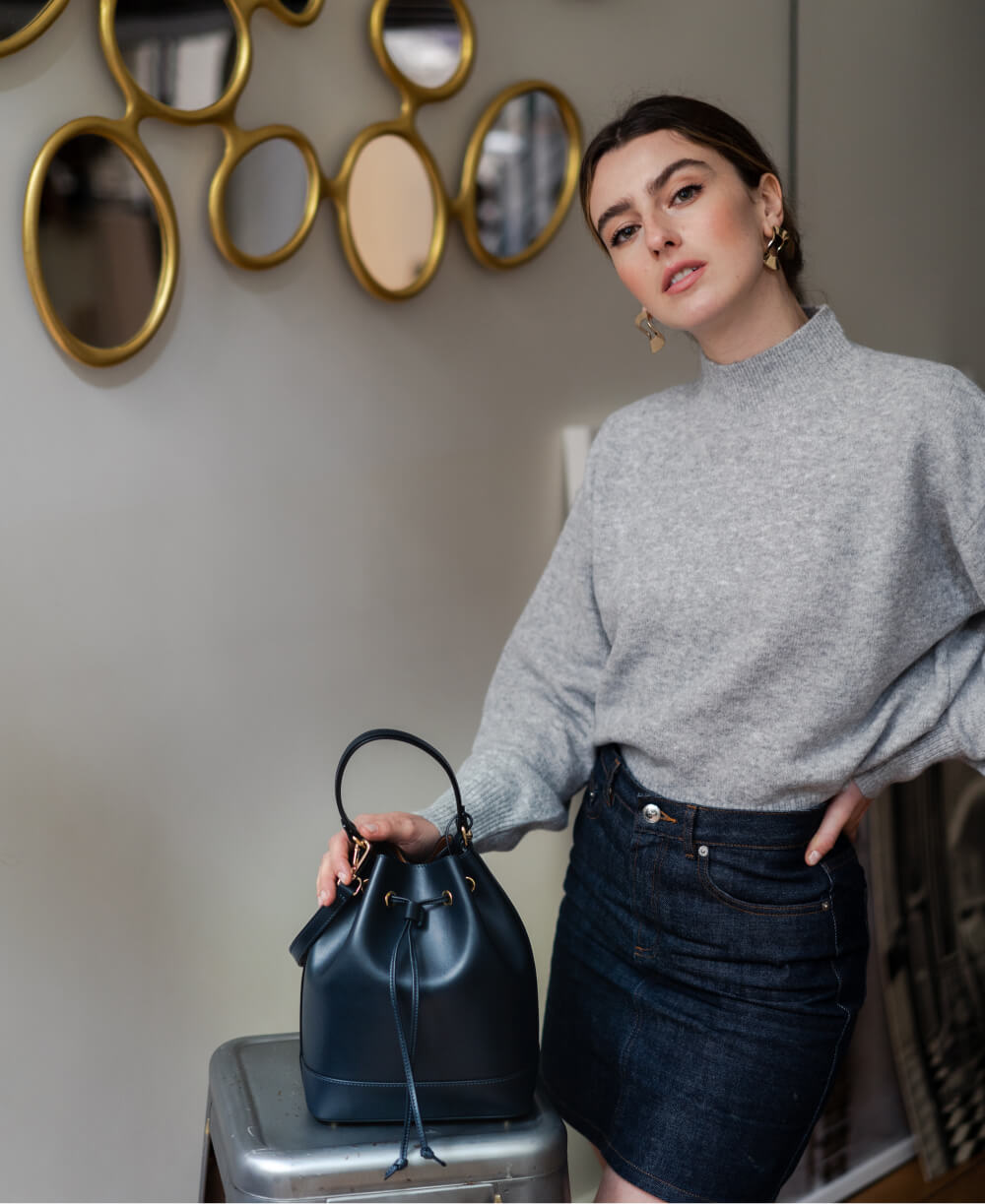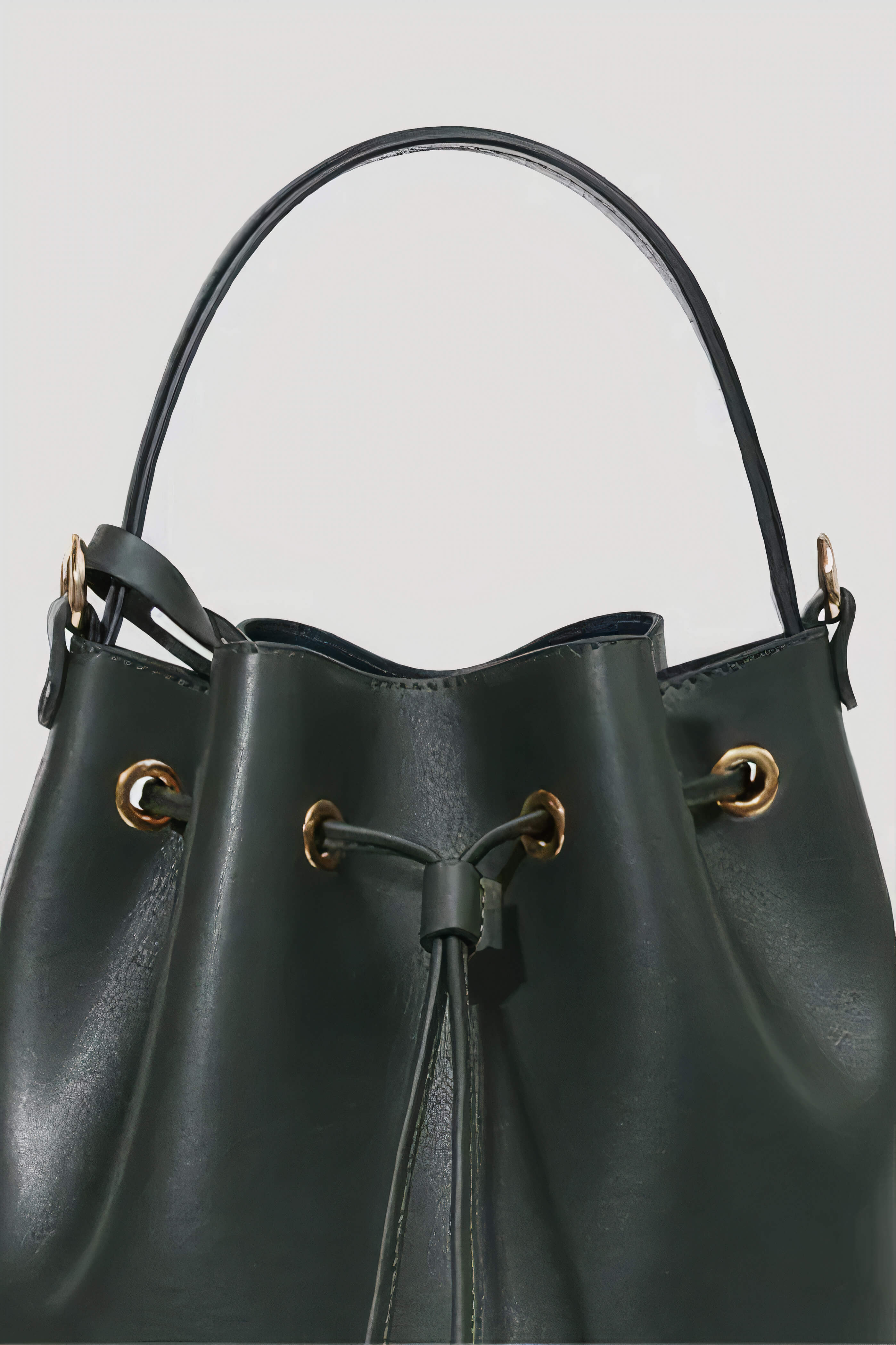 Minimalist bucket bag fully lined in leather. Can be carried by hand with its handle or on the shoulder with its leather shoulder strap. Detachable inner pocket. Sack bottom with metal studs.
