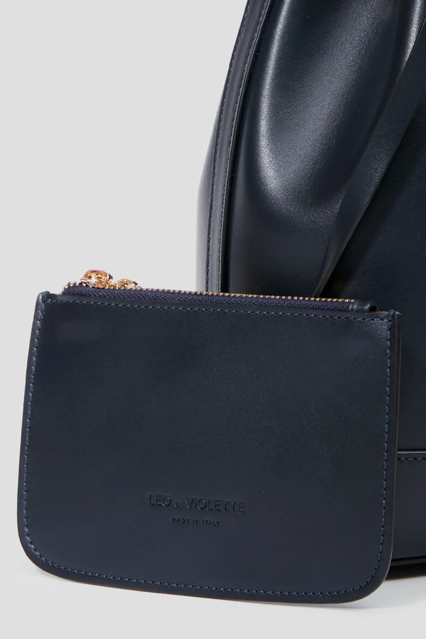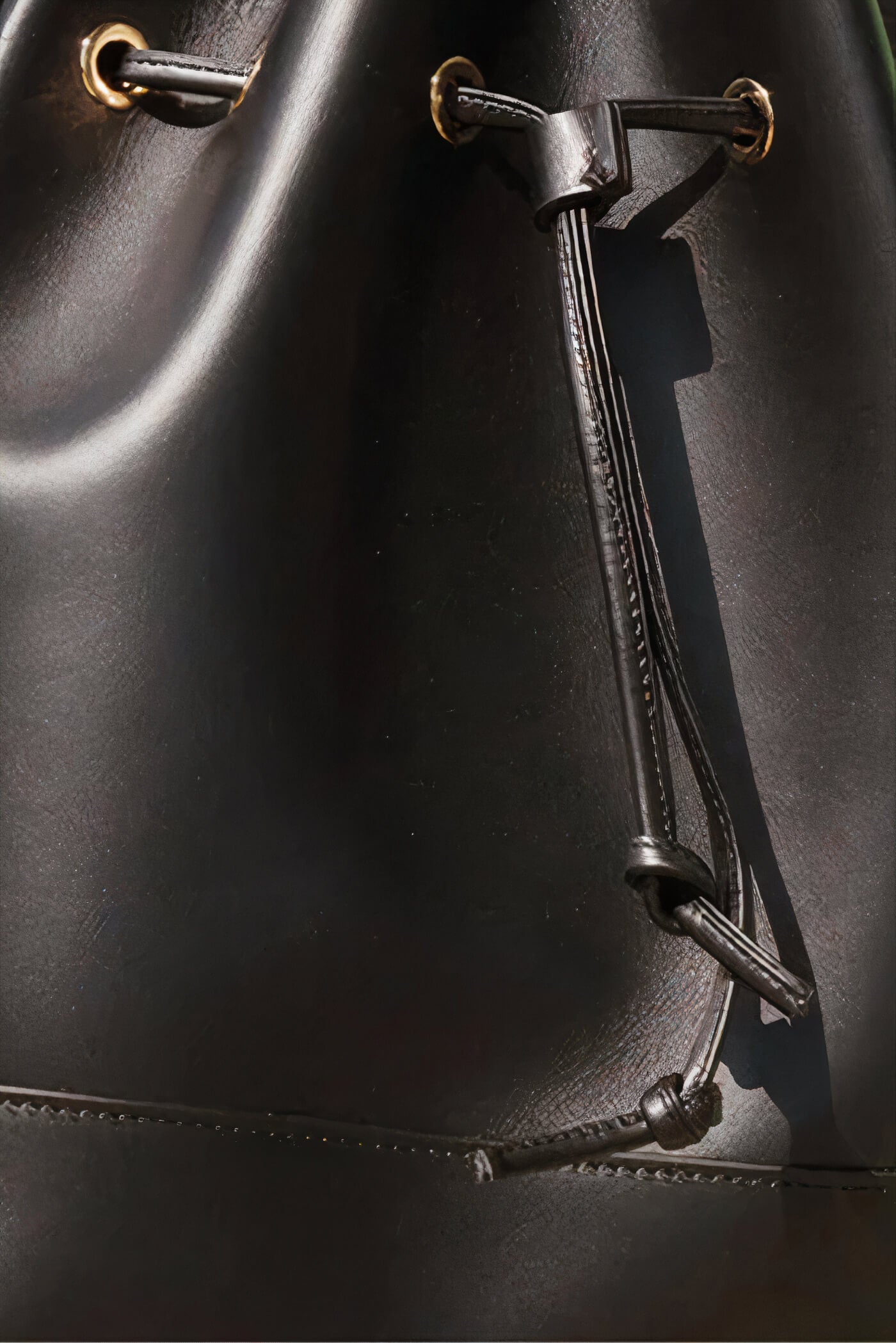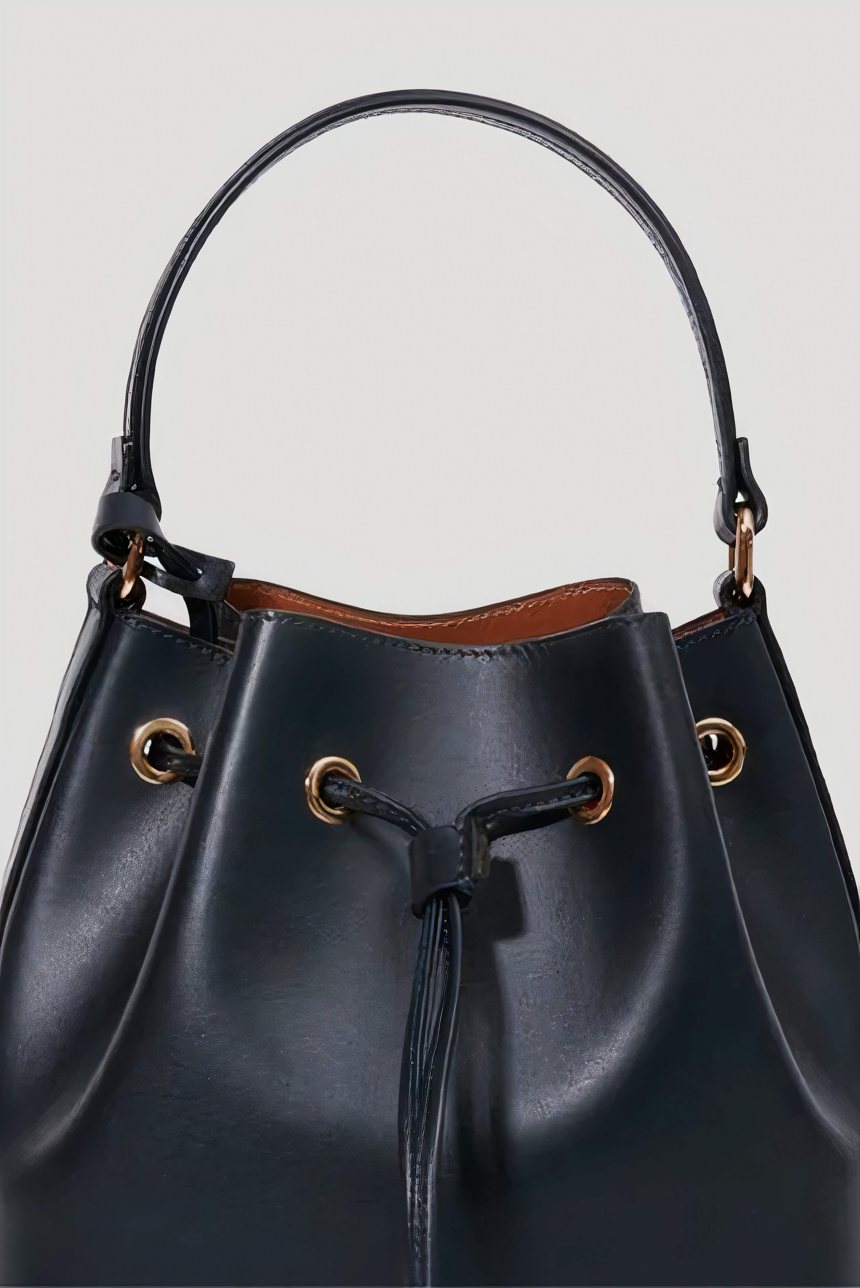 Minimalist bucket bag fully lined in leather. Can be carried by hand with its handle or on the shoulder with its leather shoulder strap. Detachable inner pocket. Sack bottom with metal studs.